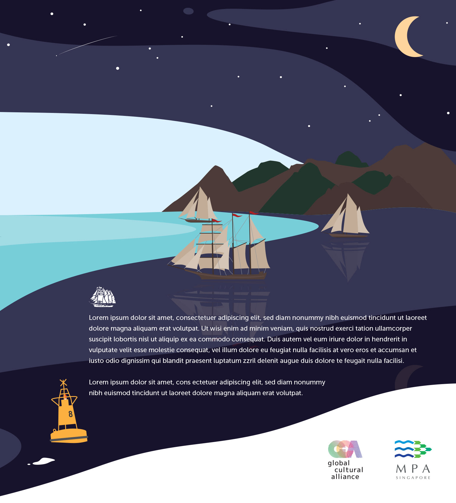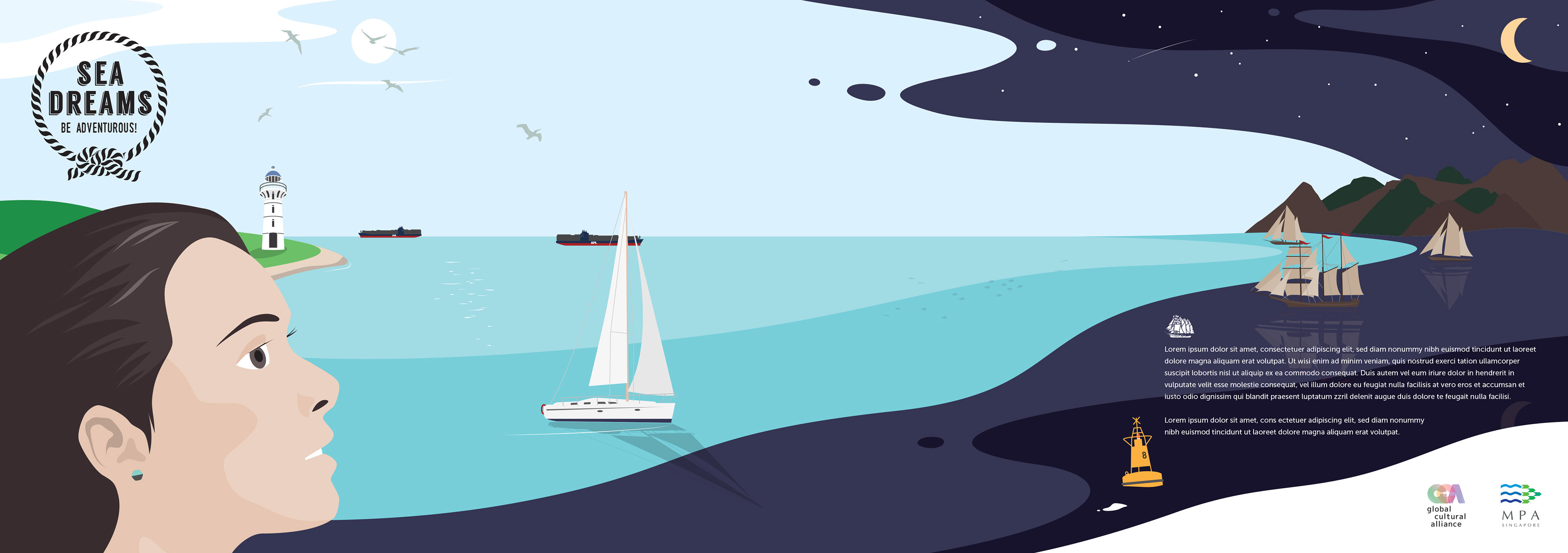 Proposed Visual for Sea Dreams, initiated by Global Cultural Alliance, supported by the Maritime Port Authority of Singapore and is an event of the Singapore Maritime Week 2017. Through colourful storytelling, rhythmically engaging music and spirited circus arts, Sea Dreams is a viscerally exciting experience that brings to life the vibrancy of Singapore’s maritime past, present and future and the opportunities the maritime sector holds for young Singaporeans in the face of today’s challenging climate. This production is inspired not only by the aspirations of young people today who seek a career in the maritime industry, but also draws from actual historical events as well as Joseph Conrad’s Lord Jim which in part was inspired by true events related to Singapore.
